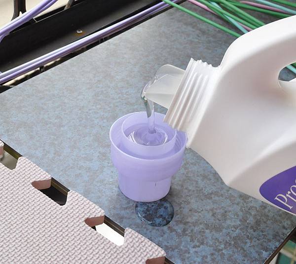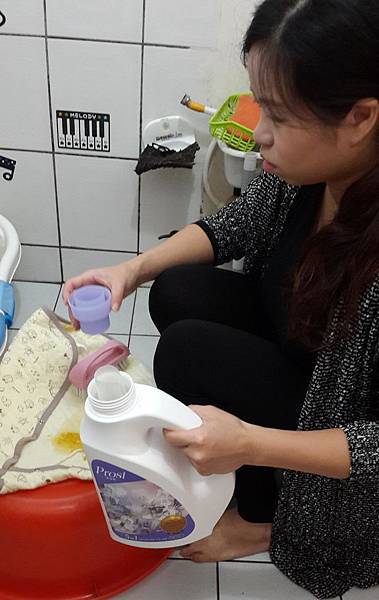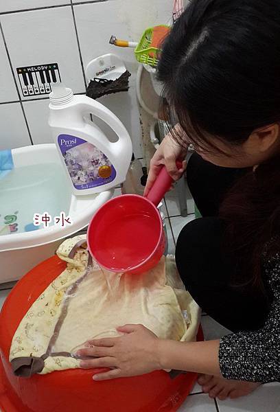 ▲先倒入1/3杯清潔劑▲加水浸泡個20分鐘以上 Tiffany是洗澡前先把它浸泡進去等洗澡完再來清洗