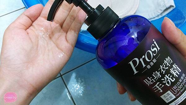 首先把水加到臉盆的一半,好讓衣服徹底浸濕,按一下Prosi普洛斯貼身衣物去漬抗菌手洗精,手洗精擠出來是透明凝露,再用雙手好好